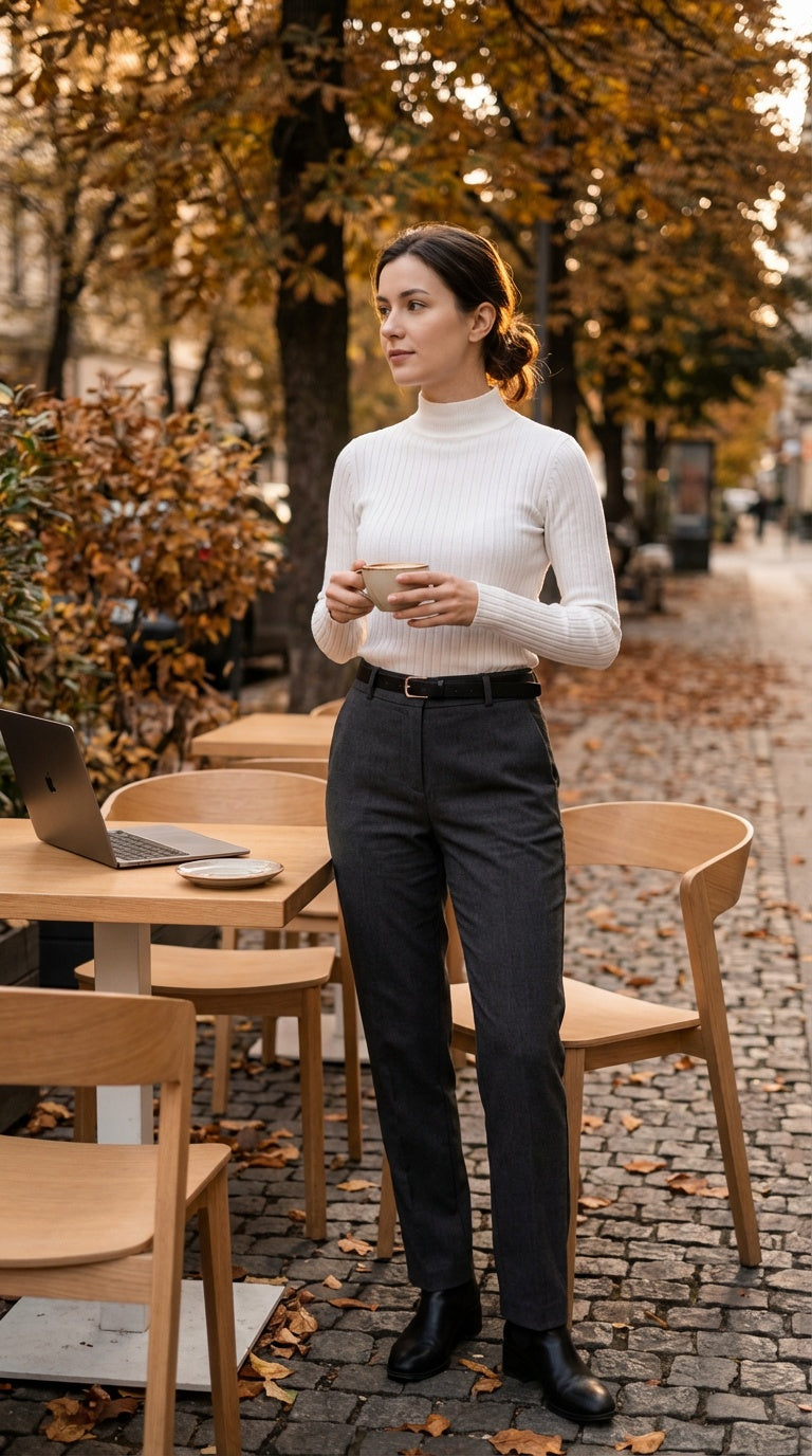Blusa blanca de cuello alto y manga larga. Clásica y versátil.