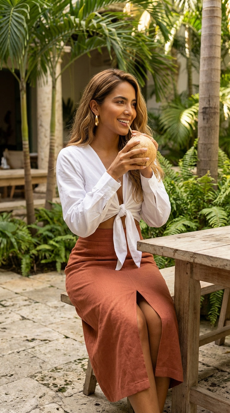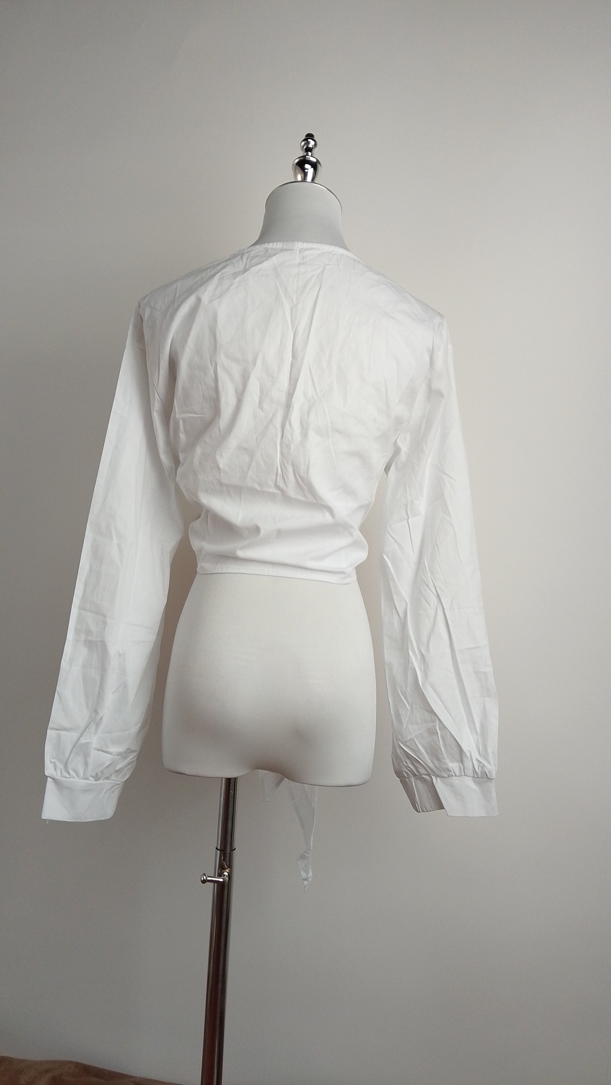 Blusa blanca con lazo frontal y manga larga. Casual chic.