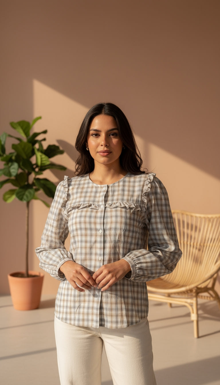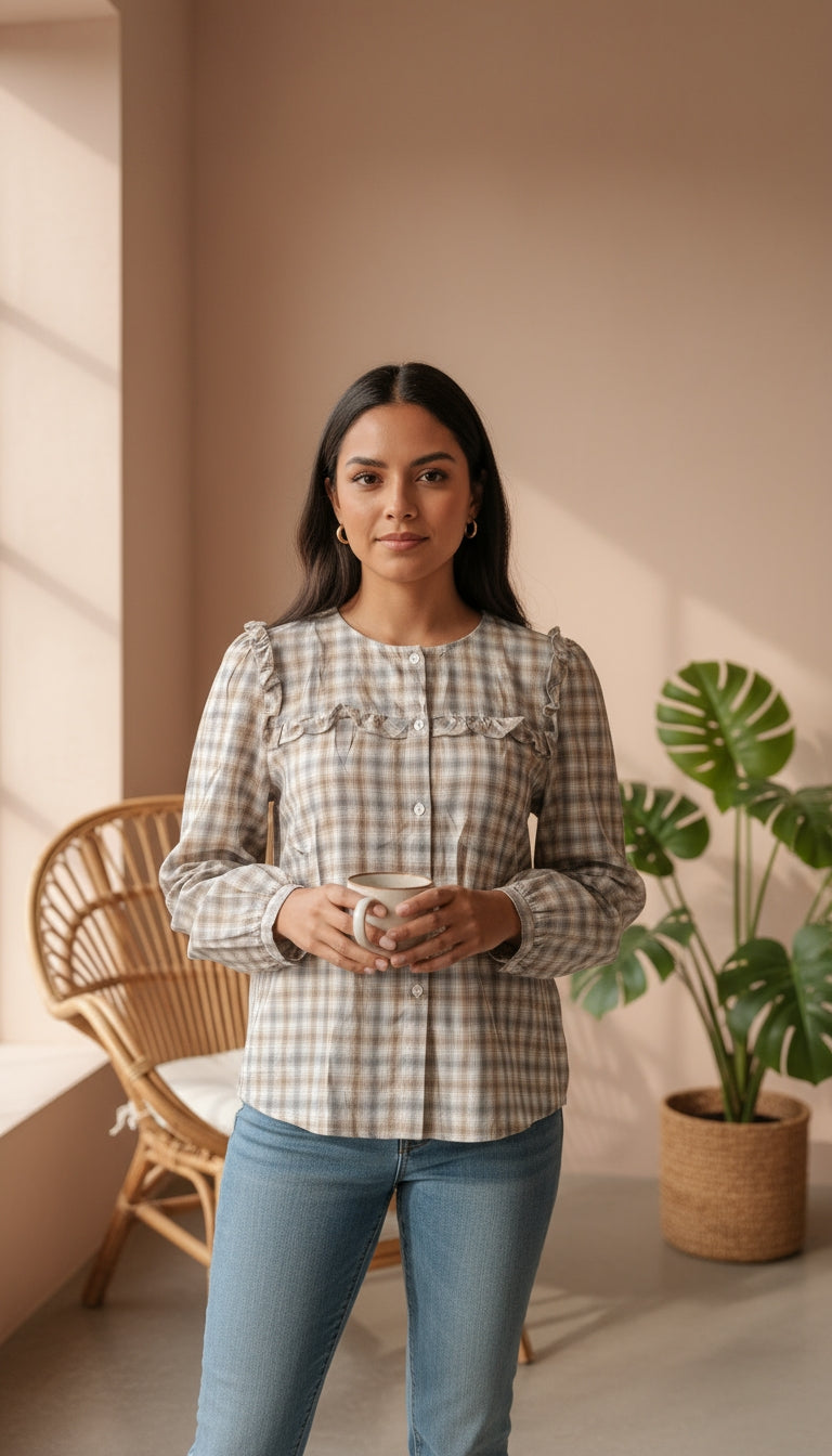 Blusa de cuadros gris y blanco, corte suelto. Perfecta para un estilo casual o urbano.