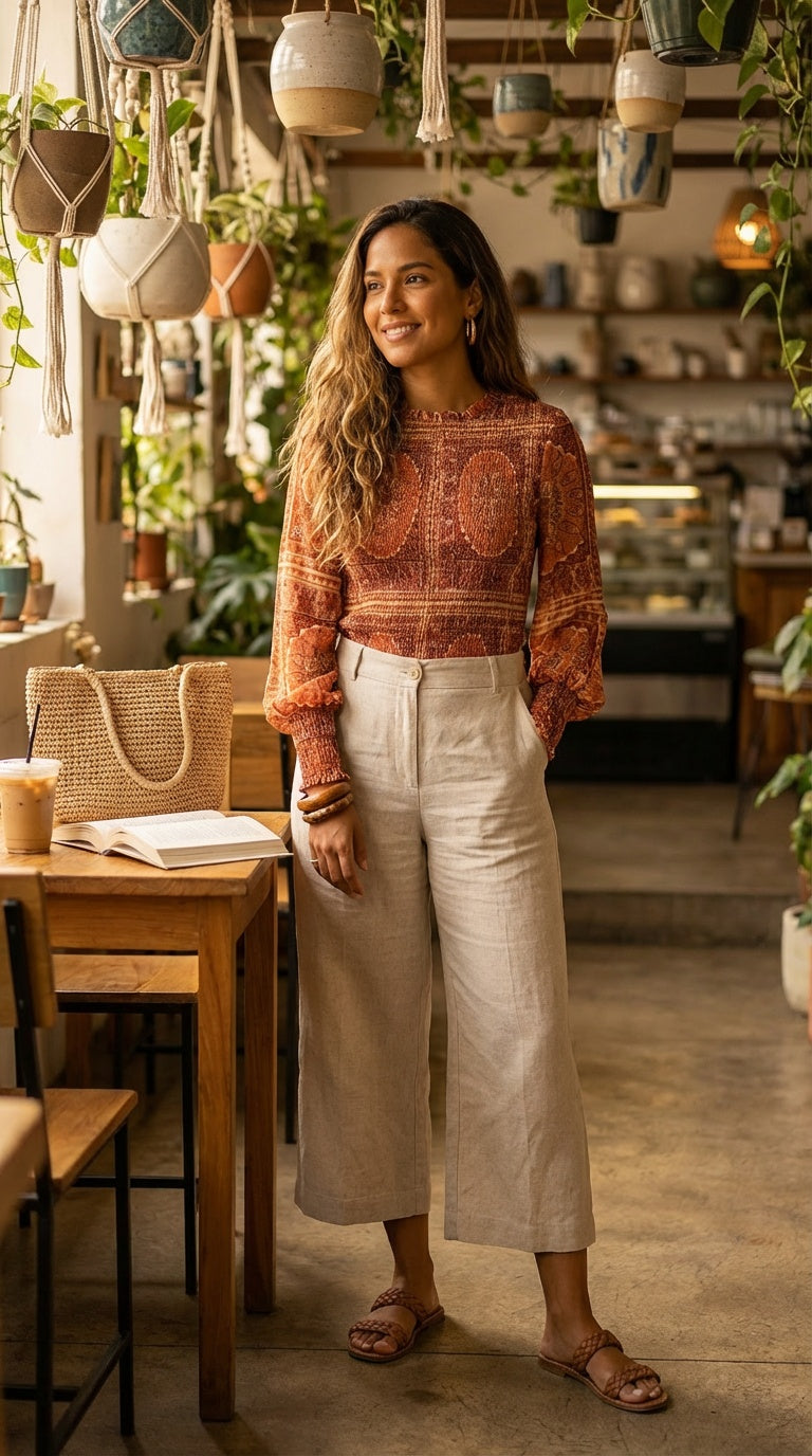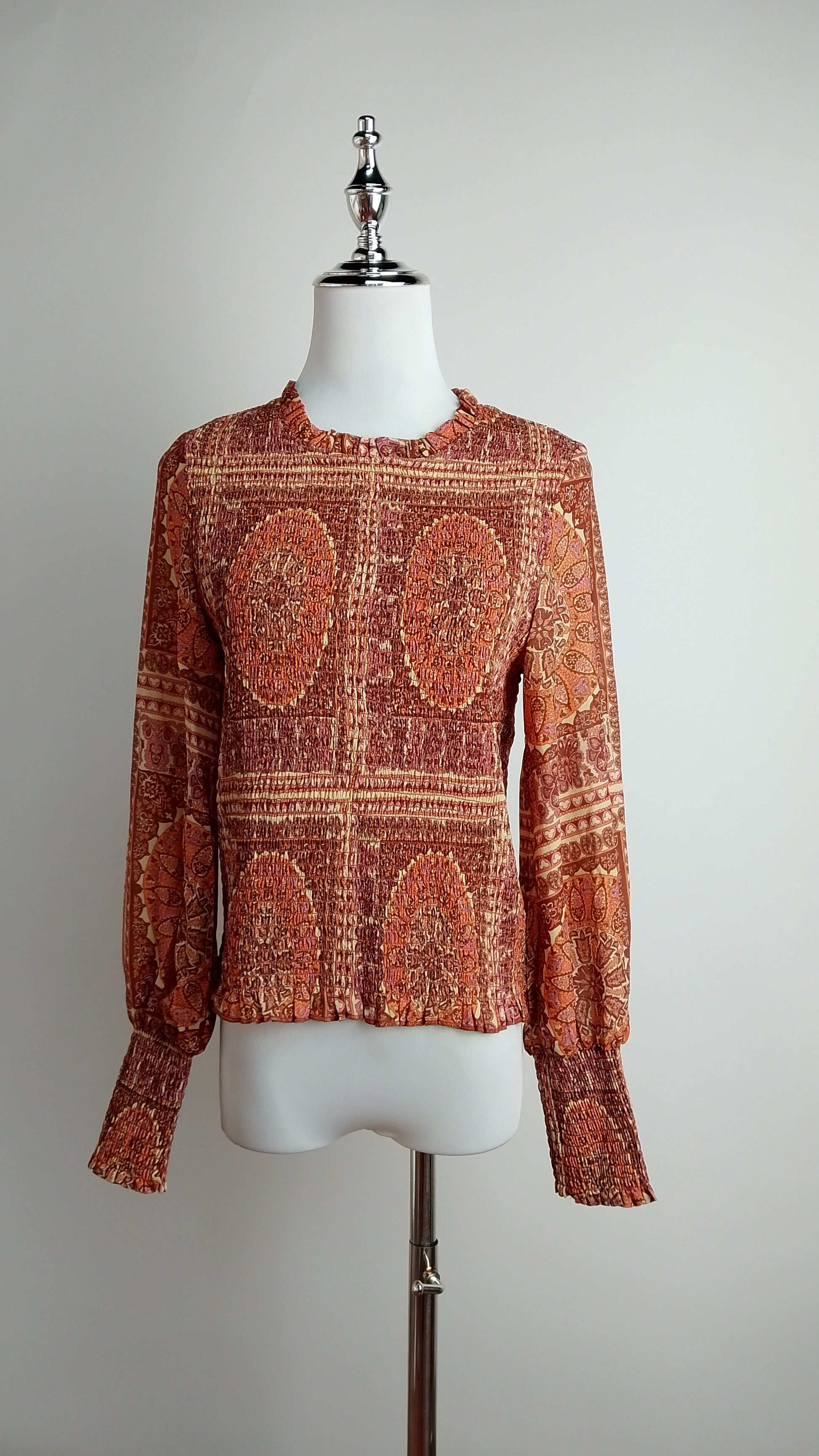Blusa estampada en tonos tierra con manga larga. Ideal para outfits bohemios.
