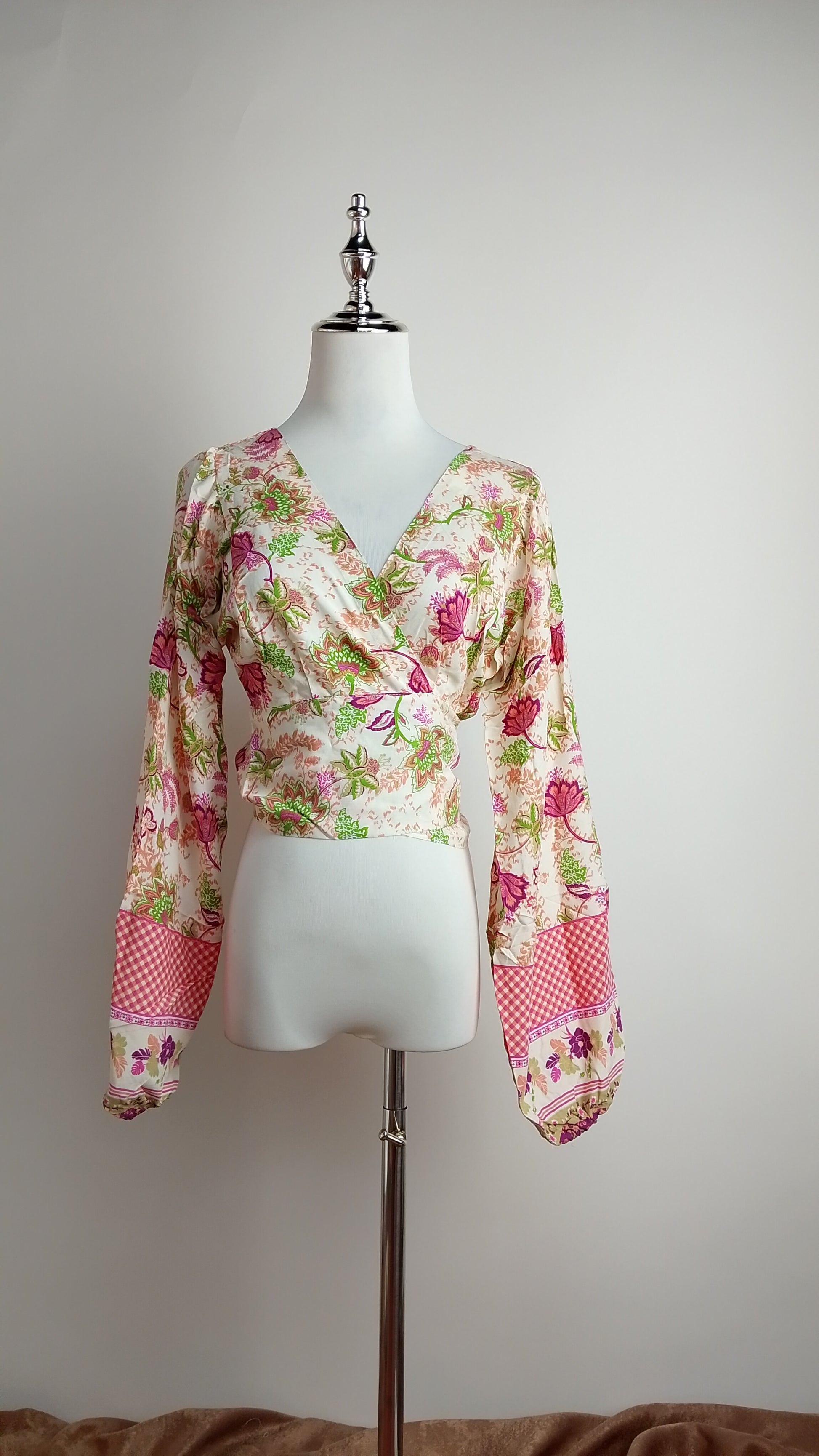 Blusa floral en tonos rosados con manga larga, perfecta para uso diario.