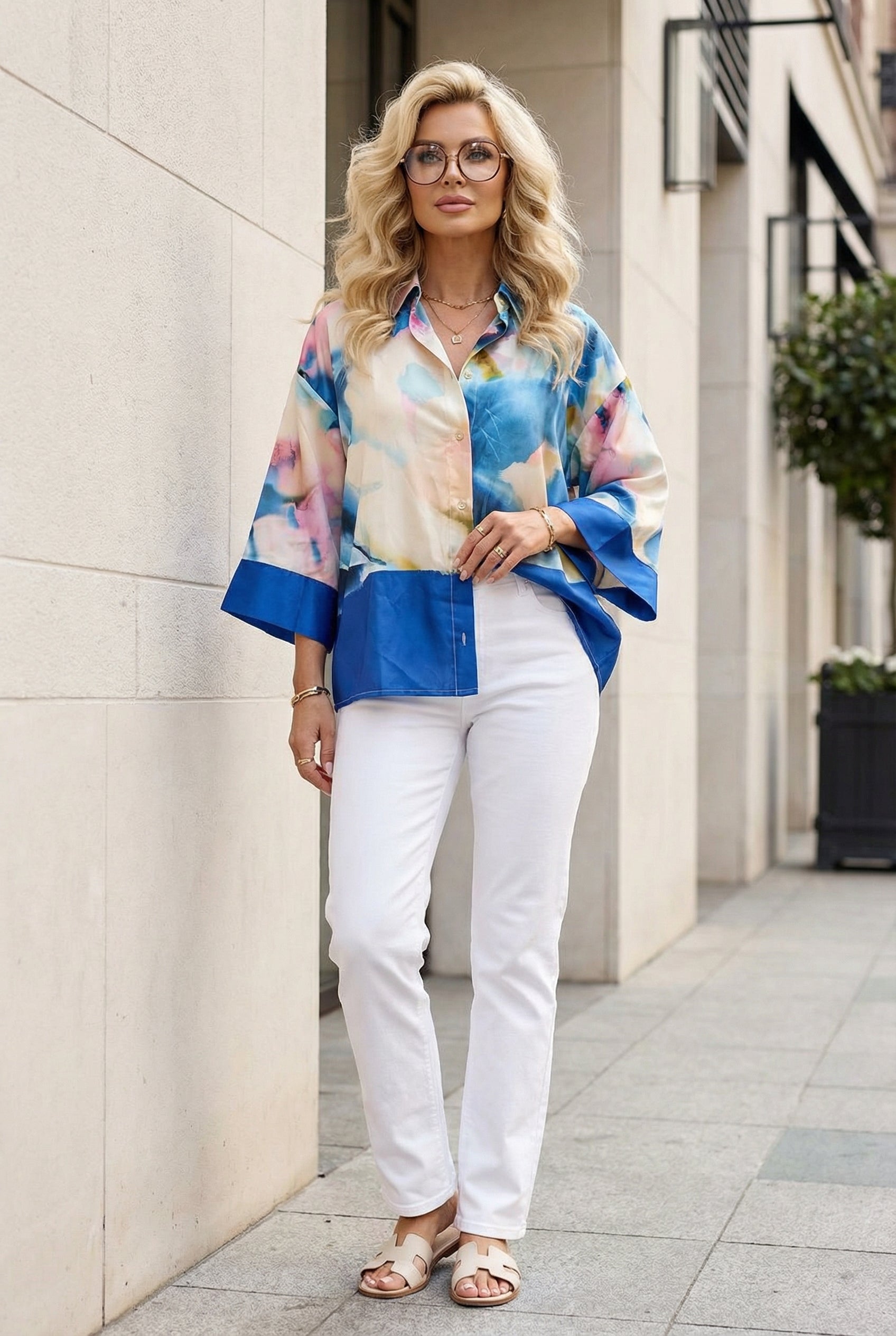 Blusa fluida en tonos azules y multicolor, fresca y elegante.