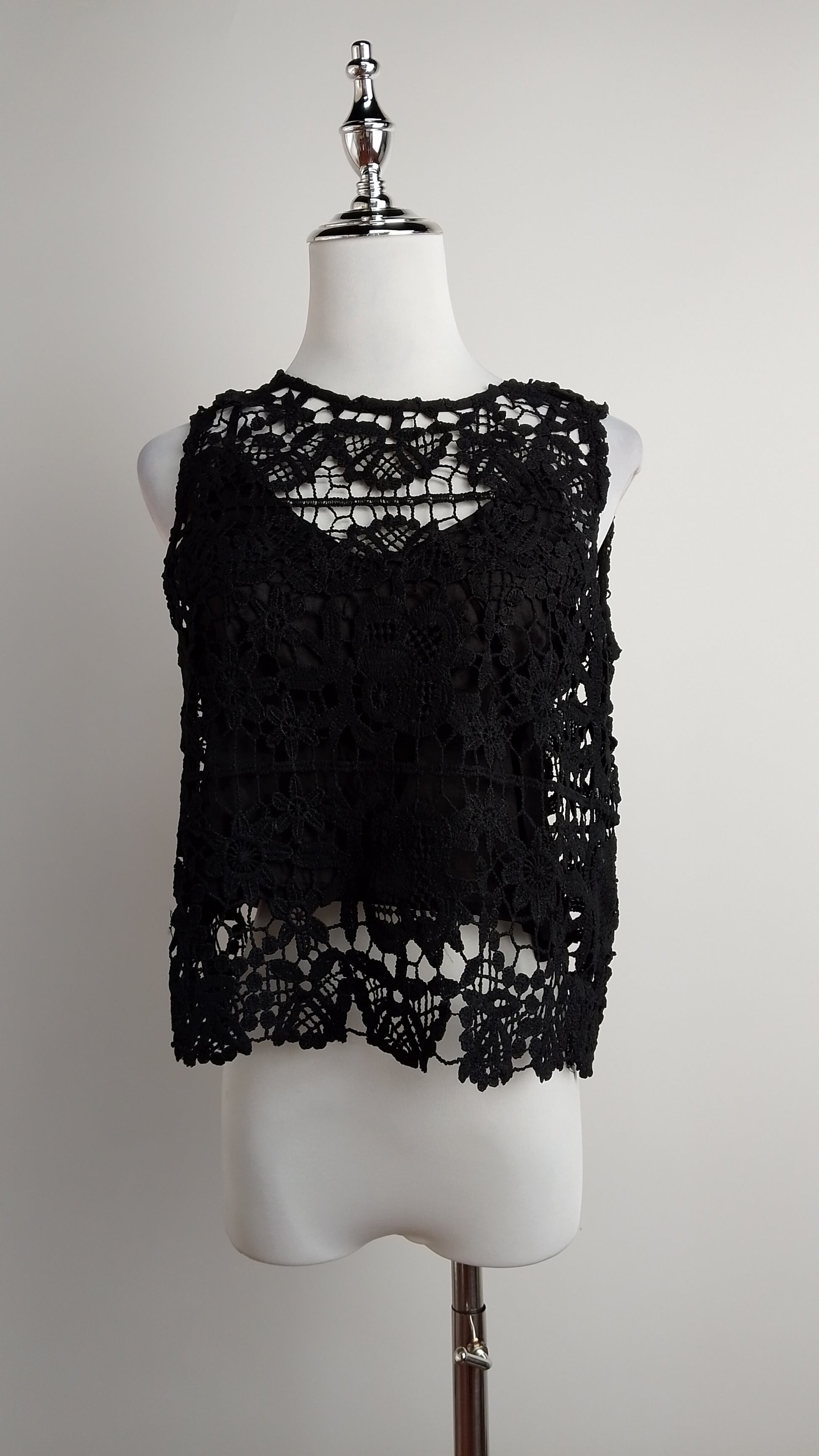 Blusa negra sin mangas con encaje delicado. Perfecta para ocasiones especiales.