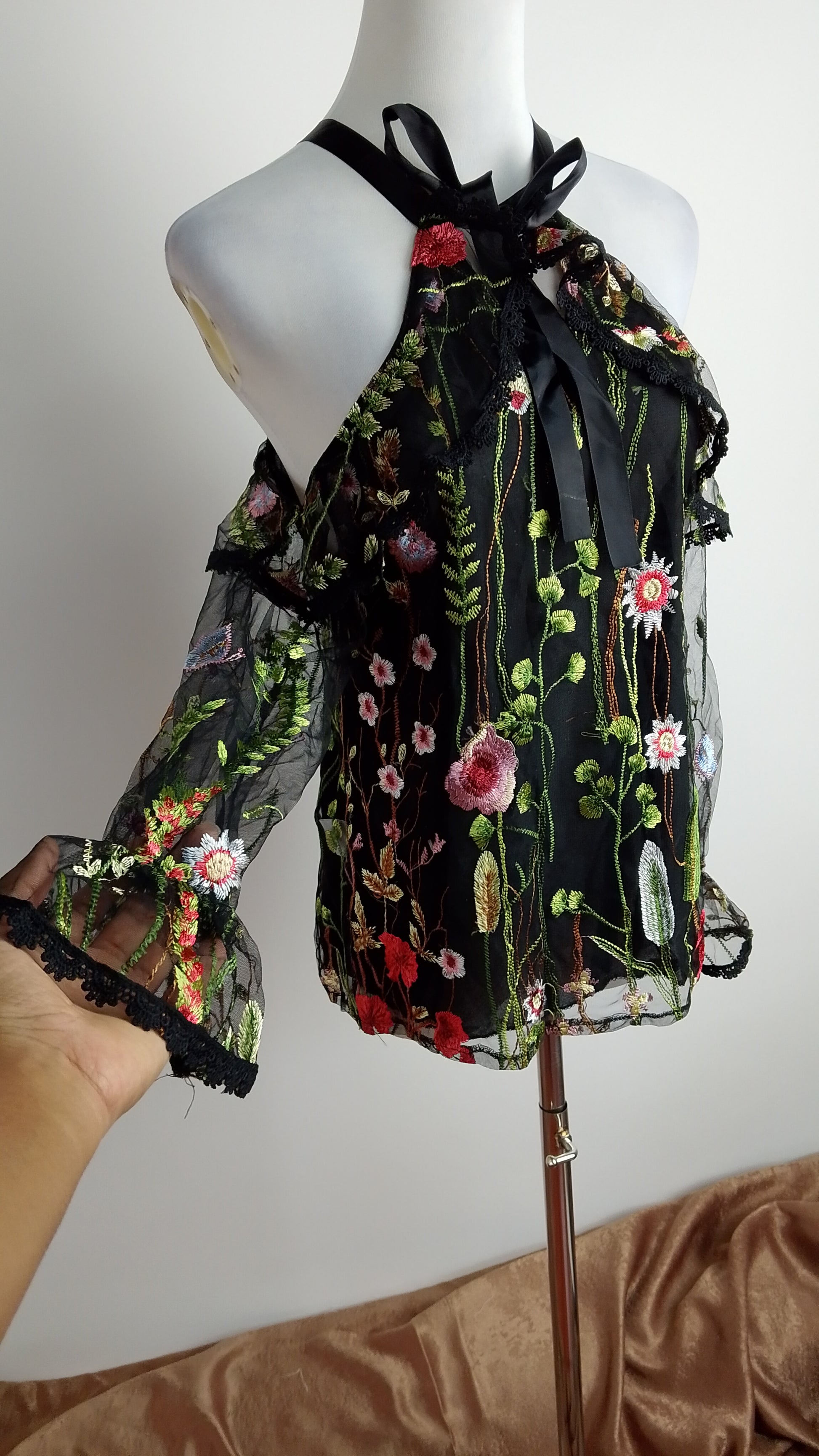 Blusa negra con hombros descubiertos y estampado floral sutil. Estilo boho elegante.