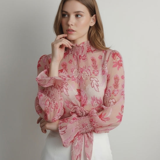 Blusa de base rosa con estampado floral y botones frontales. Ideal para looks primaverales.