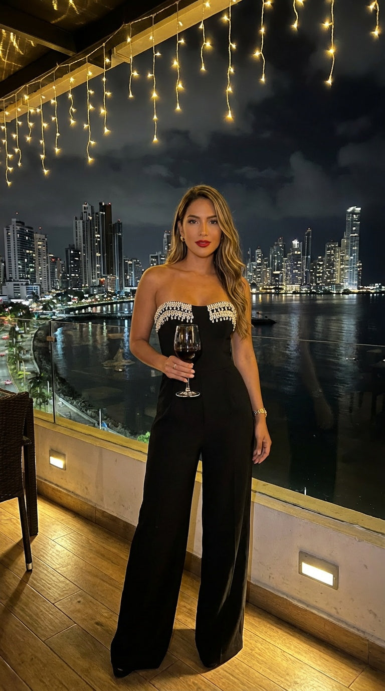 Enterizo negro strapless con detalle en busto y pantalón ancho. Ideal para eventos nocturnos.