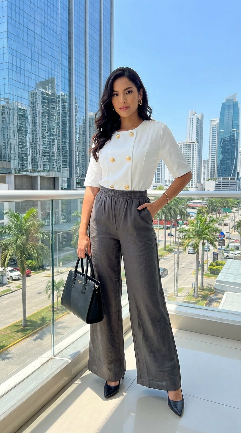 Pantalón palazzo gris oscuro de corte elegante y versátil.