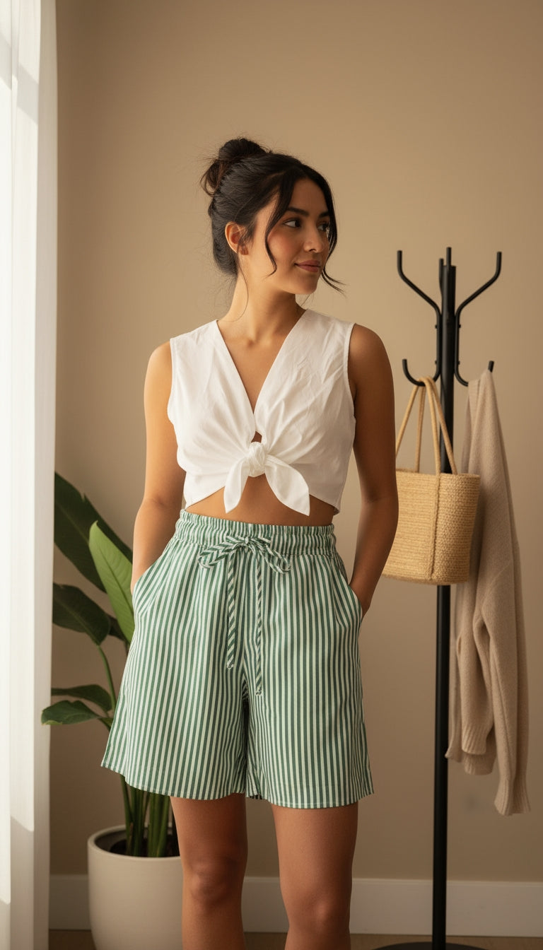 Short en tonos pastel con corte alto y pinzas. Ideal para outfits veraniegos.