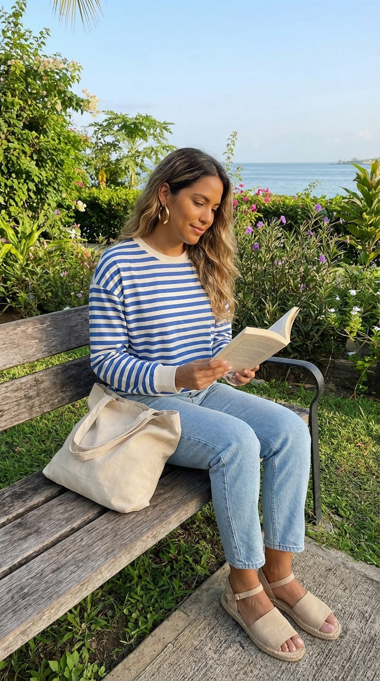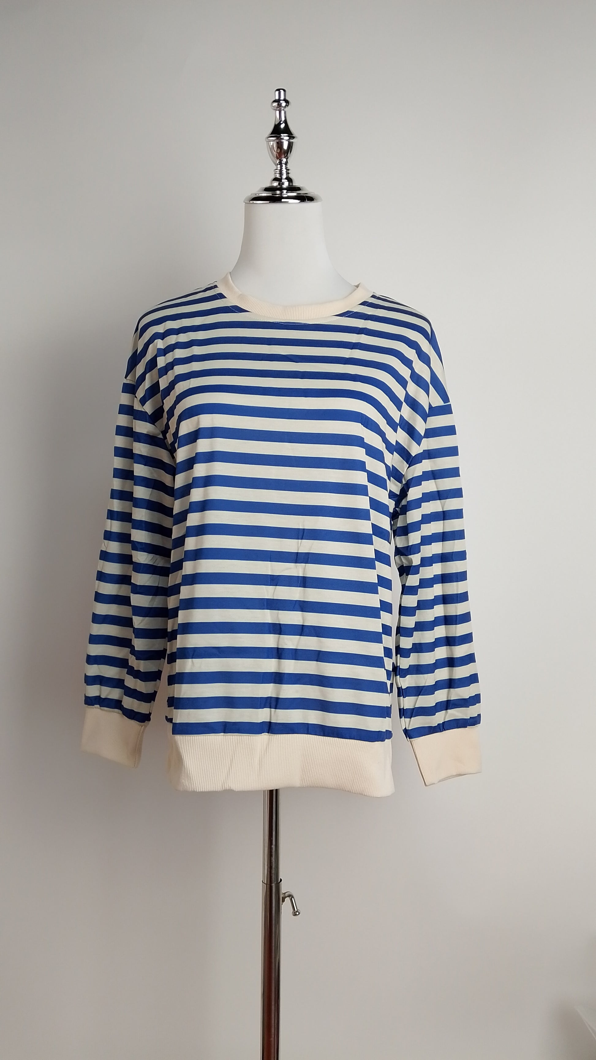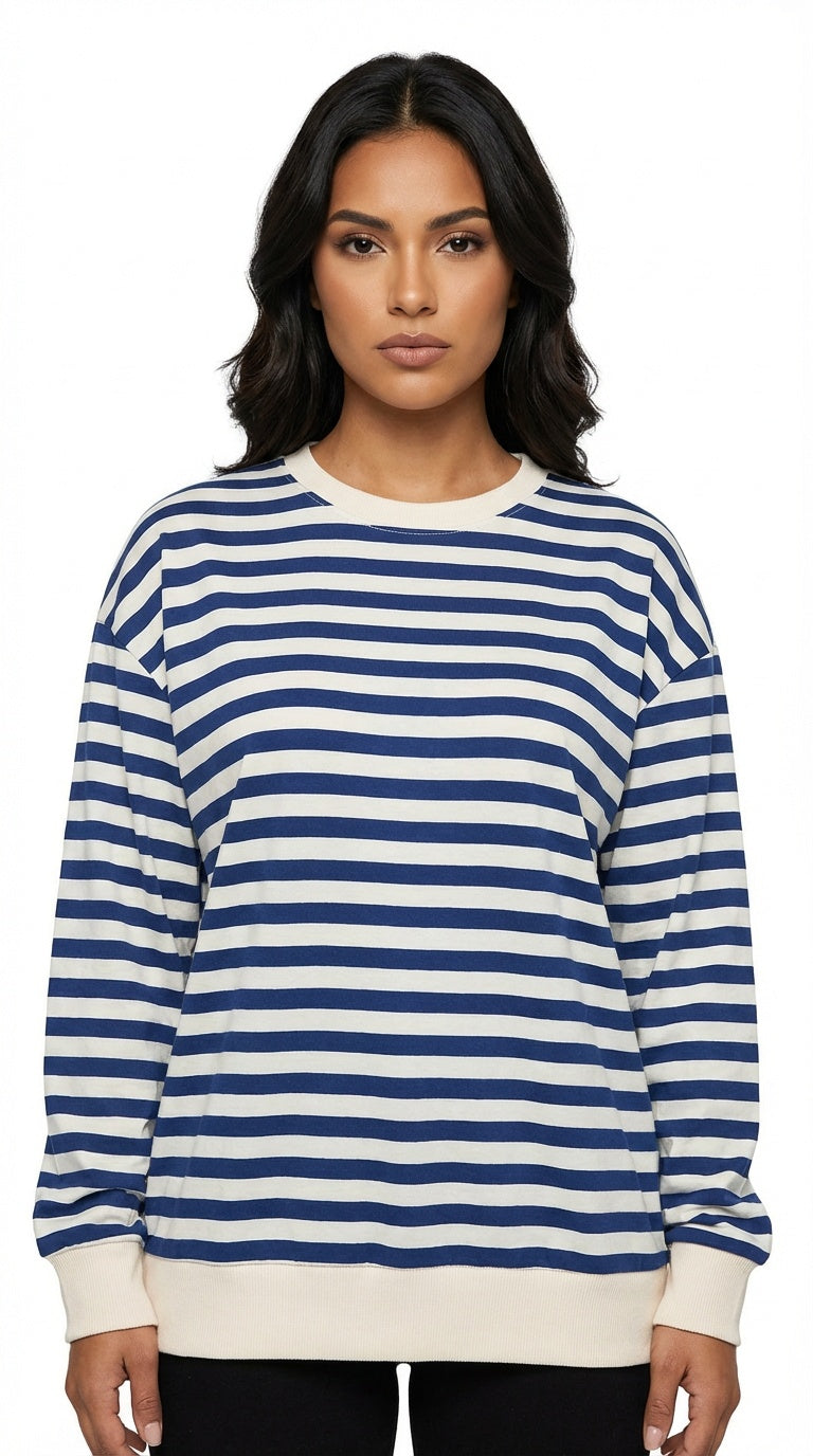 Suéter de manga larga con rayas azules y blancas. Básico casual.