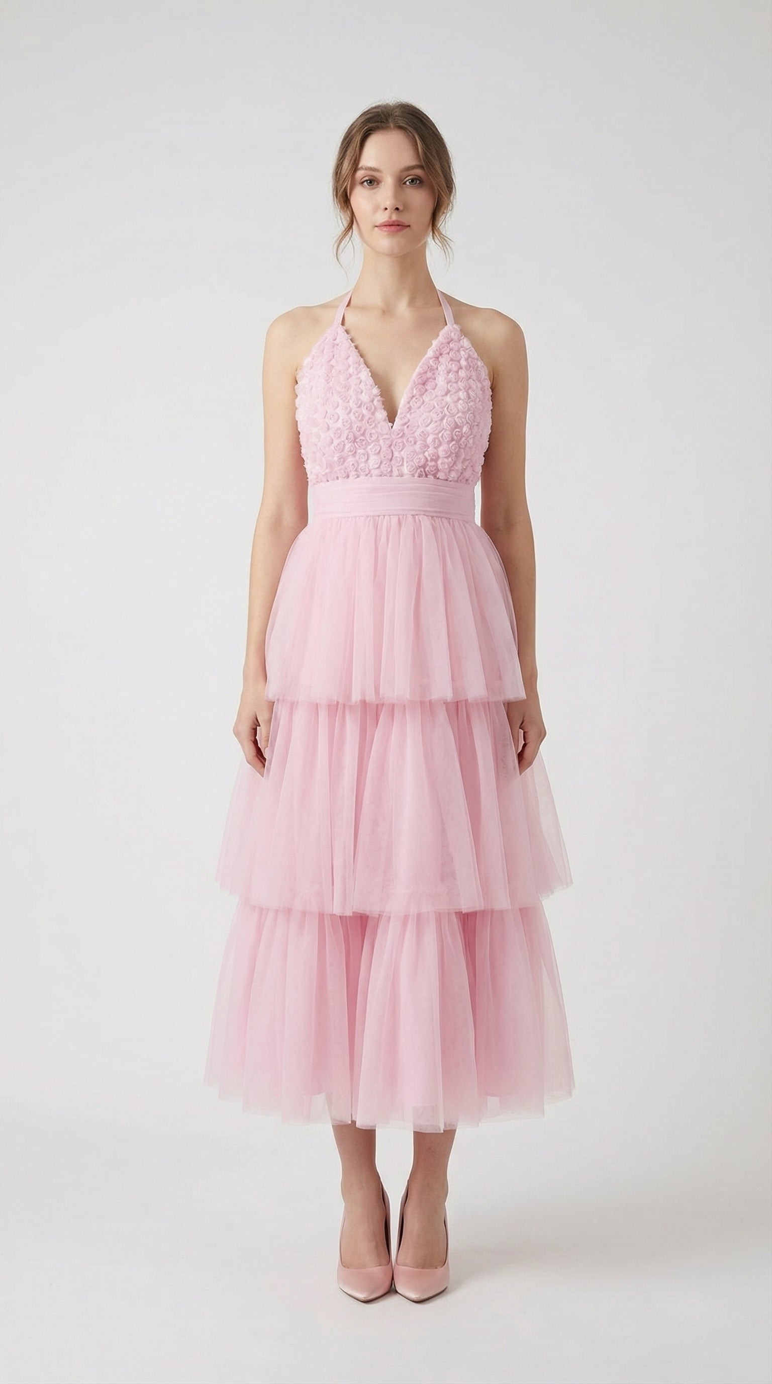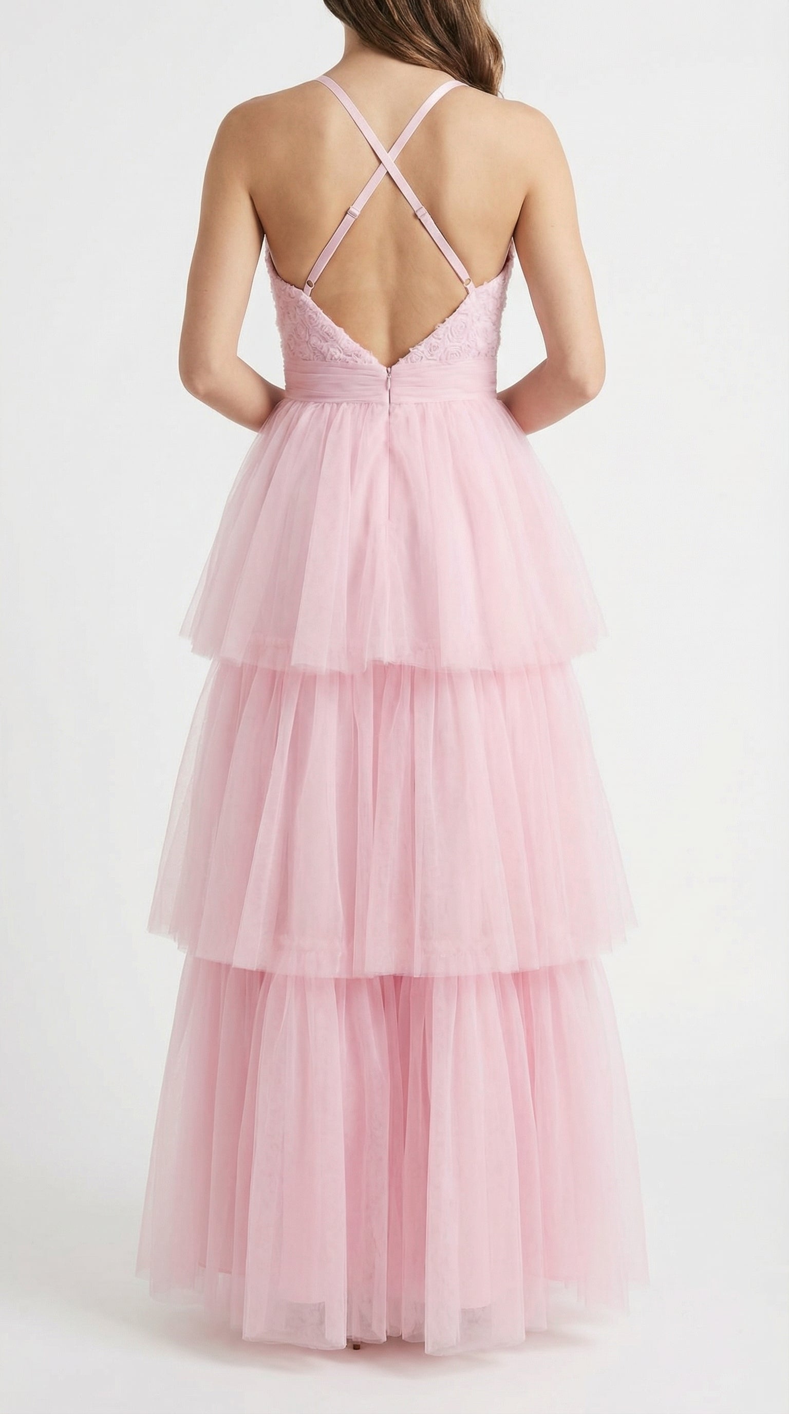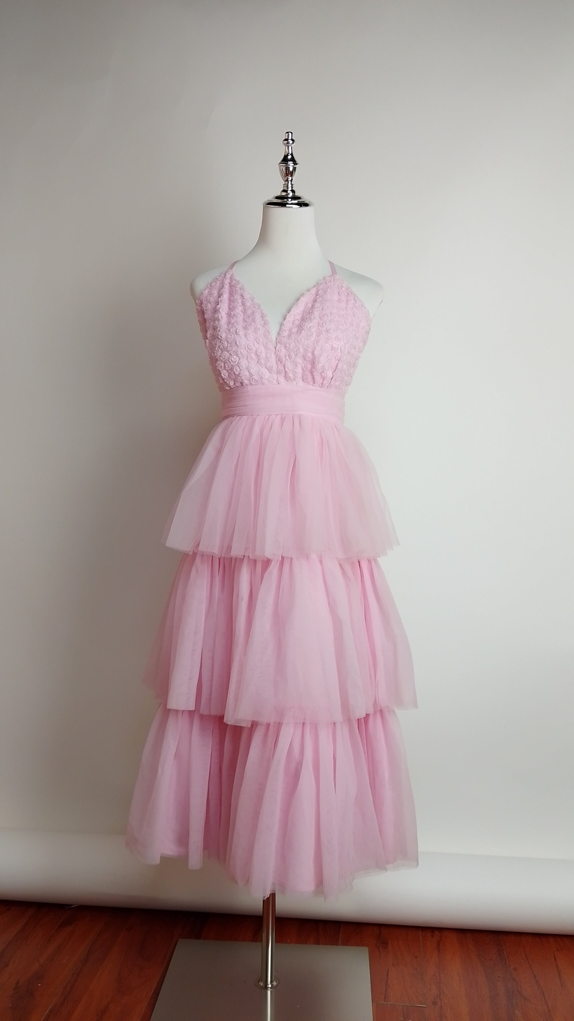 Vestido largo rosa estilo princesa con capas de tul y corset delicado.