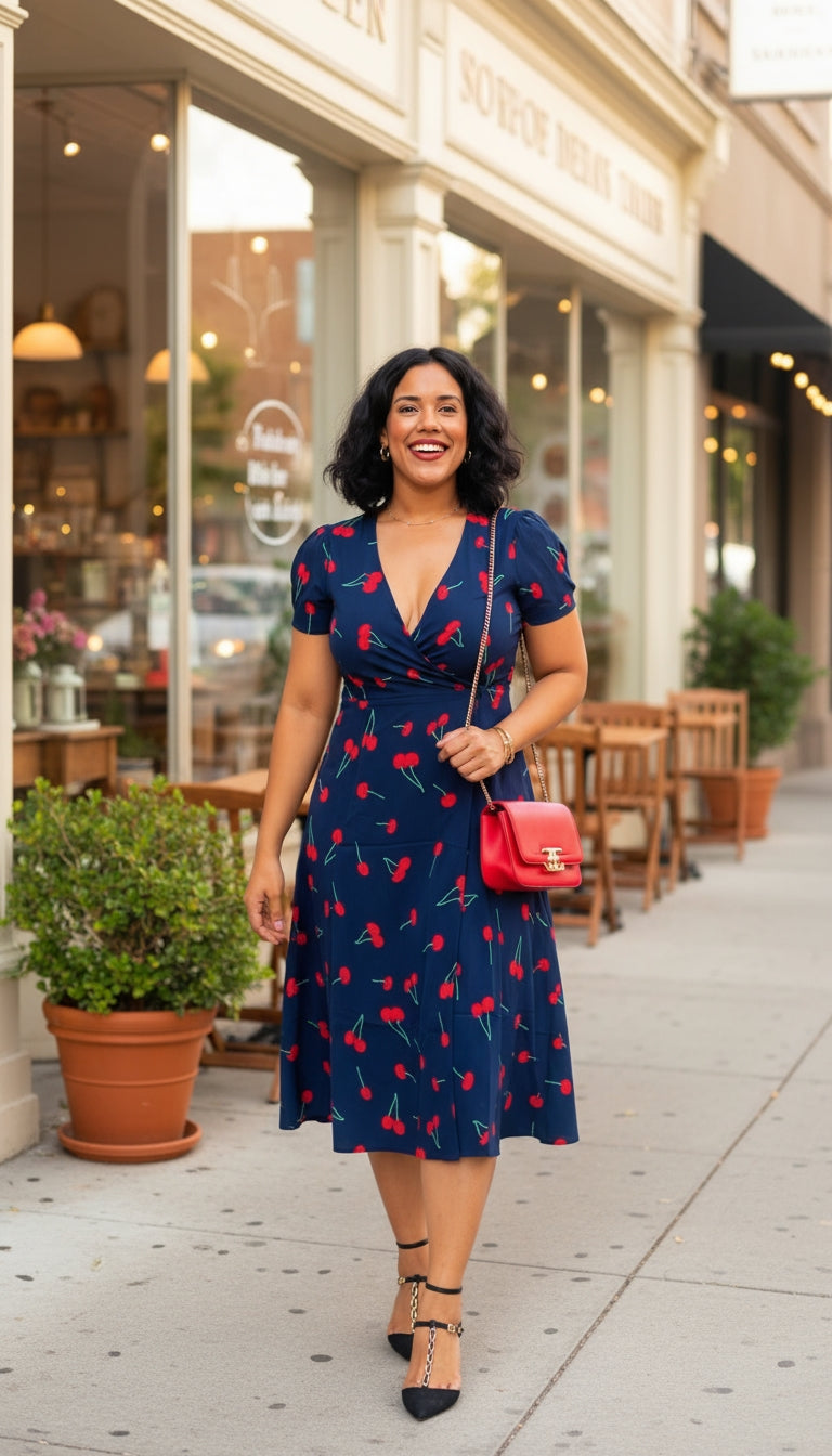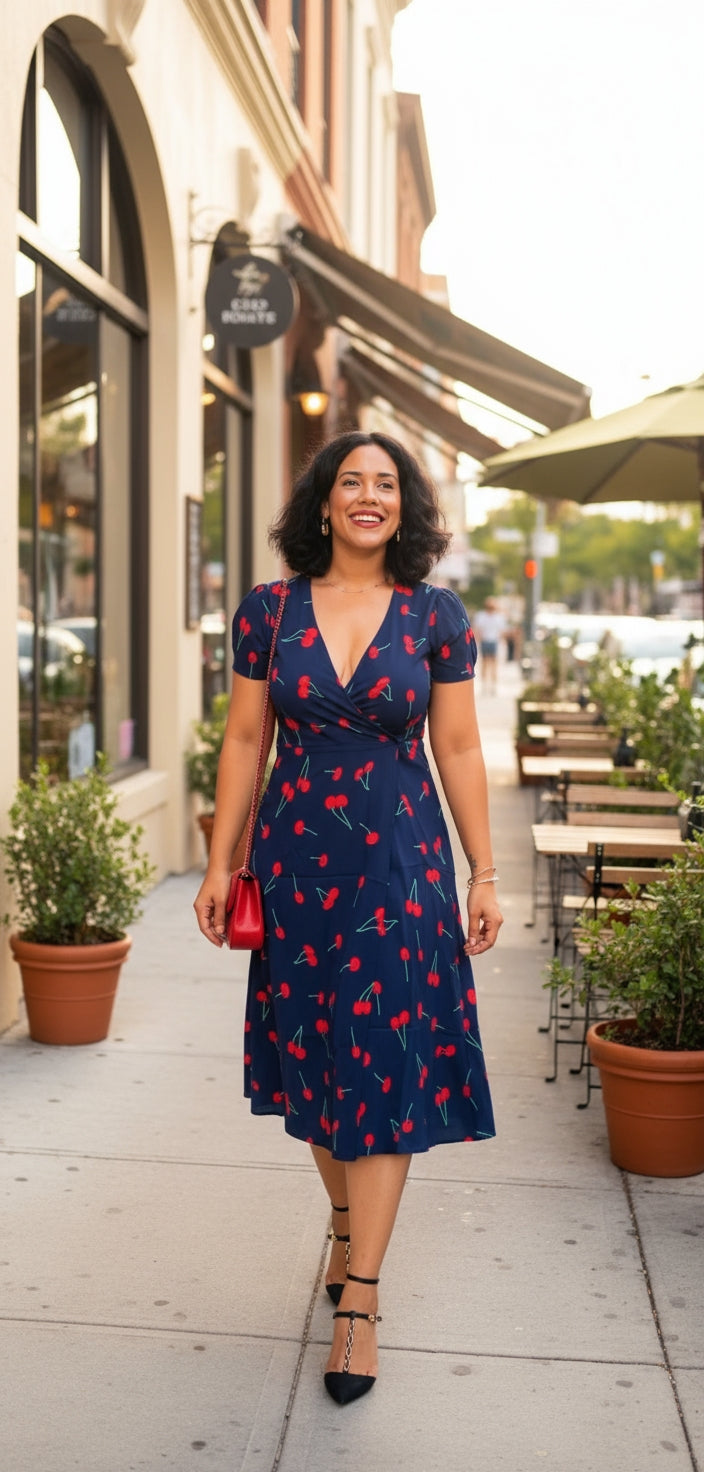 Vestido azul marino con 🍒, cuello en V y botones decorativos. Corte ajustado en cintura. Tallas: 100% POLIÉSTER