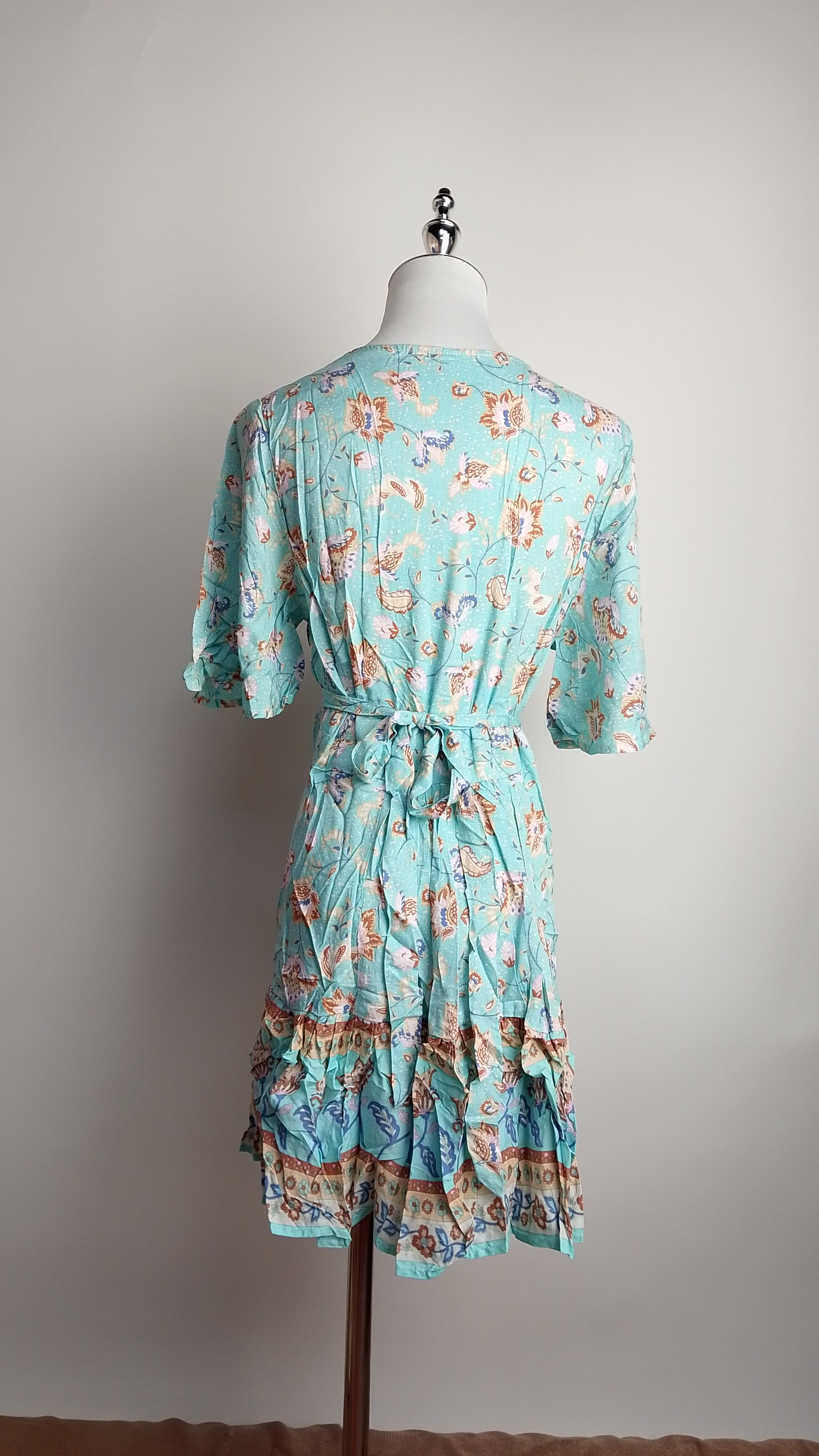 Vestido celeste con estampado vintage, escote en V y manga corta, estilo casual y femenino.