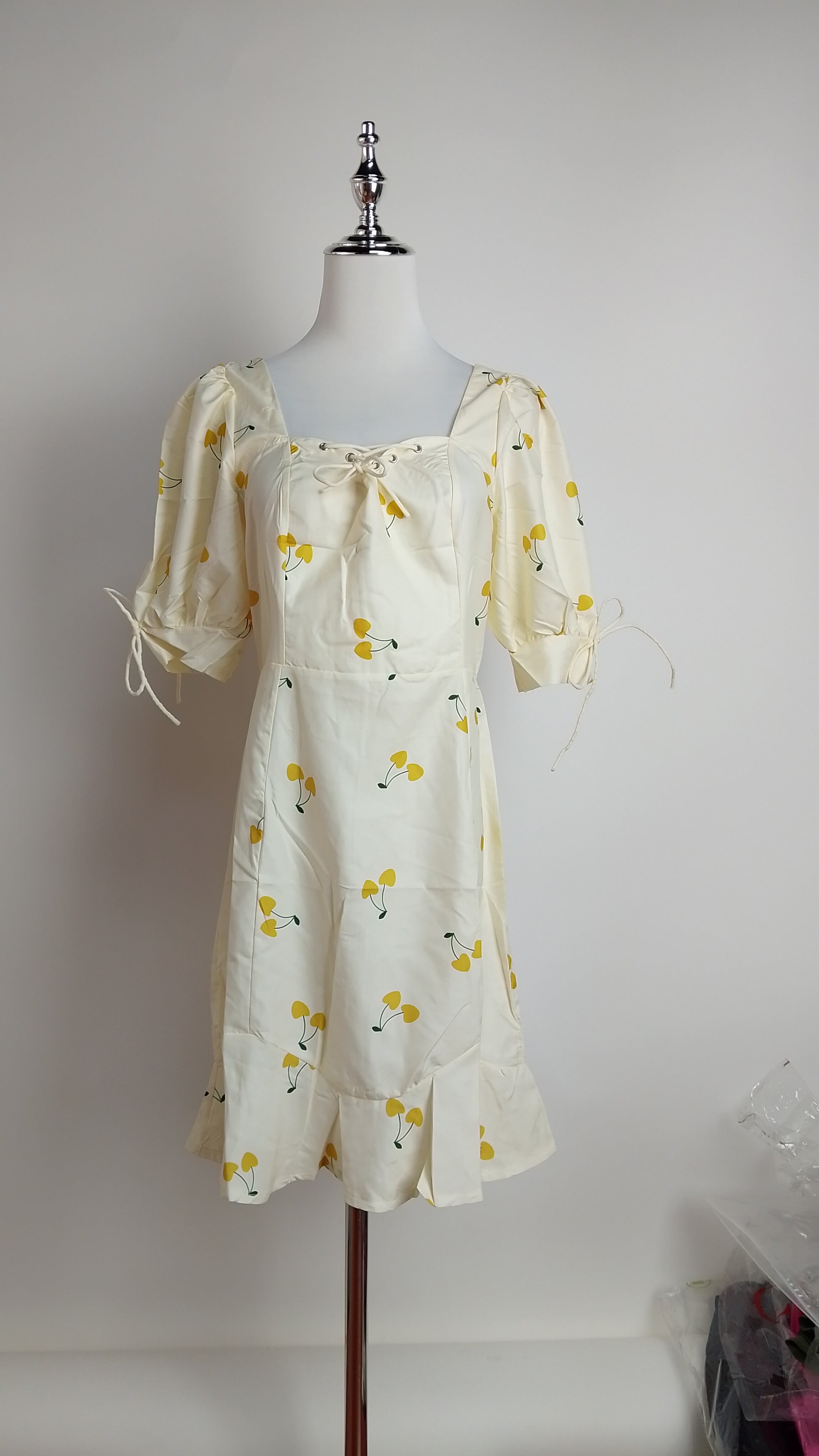 Vestido corto amarillo con estampado floral y mangas cortas. Fresco y juvenil.
