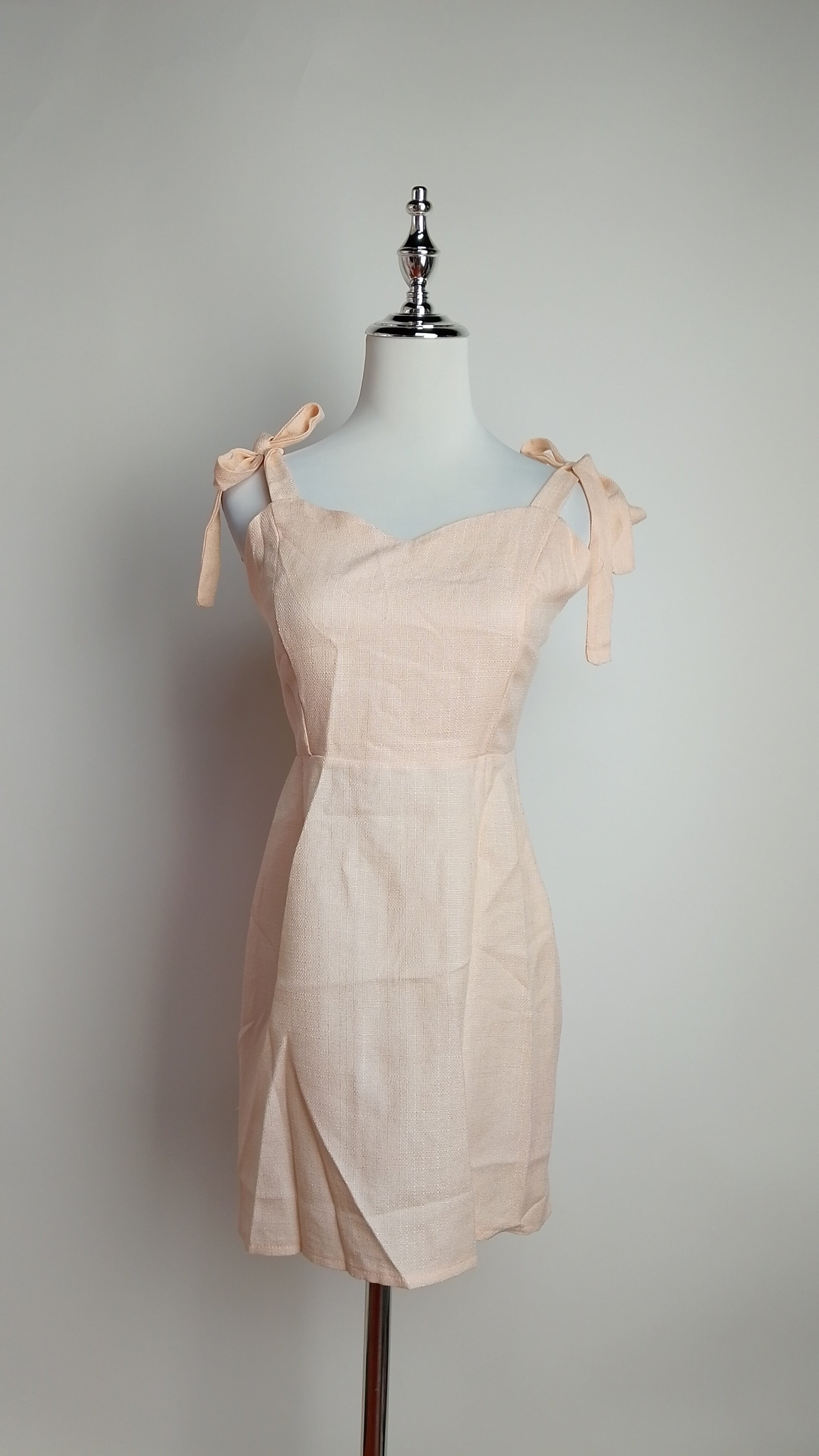 Vestido corto beige con lazo en el hombro y corte ajustado. Femenino y delicado.