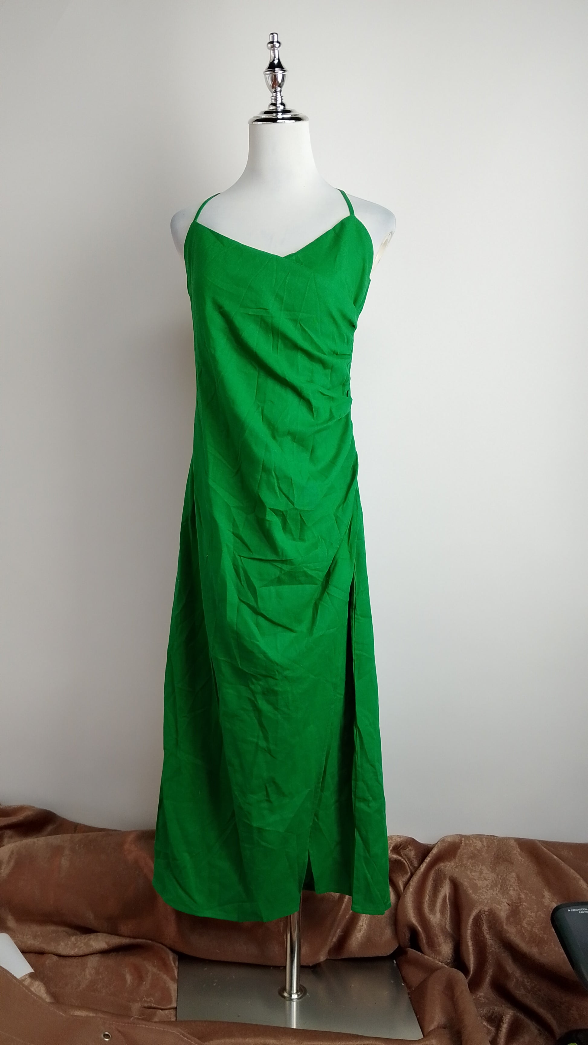 Vestido verde vibrante con tirantes, fresco y tropical.