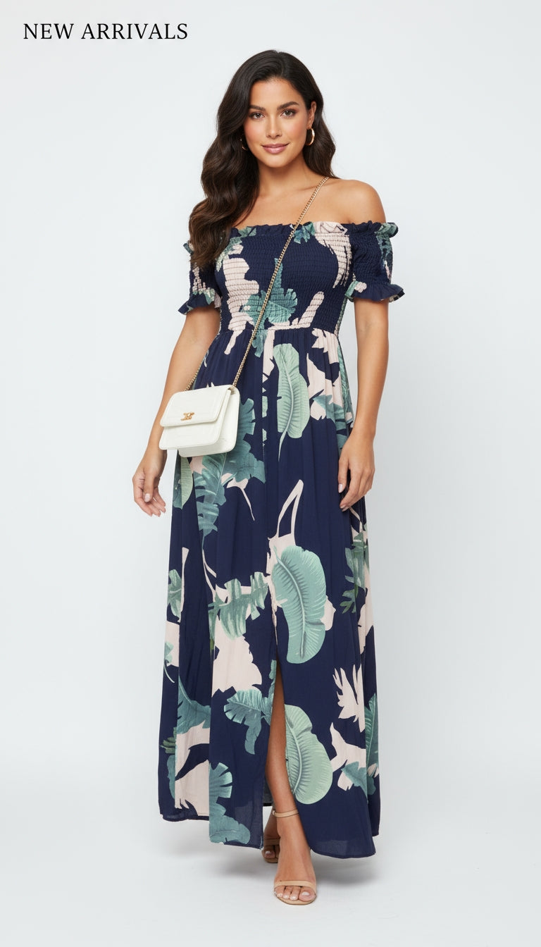 Vestido largo azul tropical con hombros descubiertos /ANV04