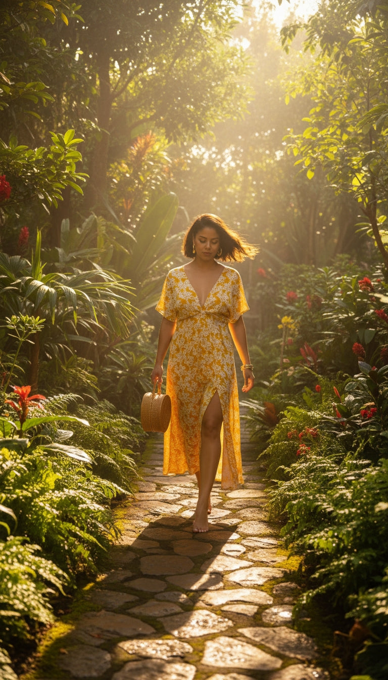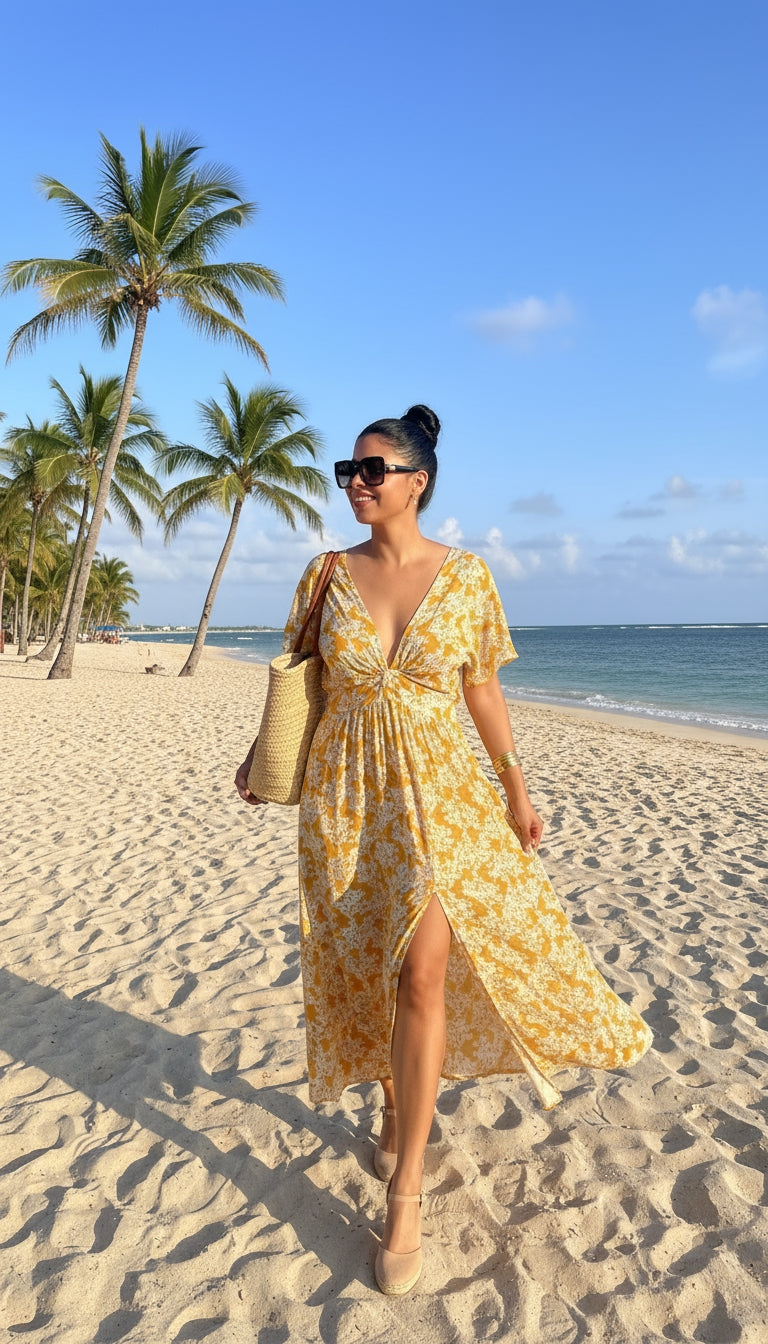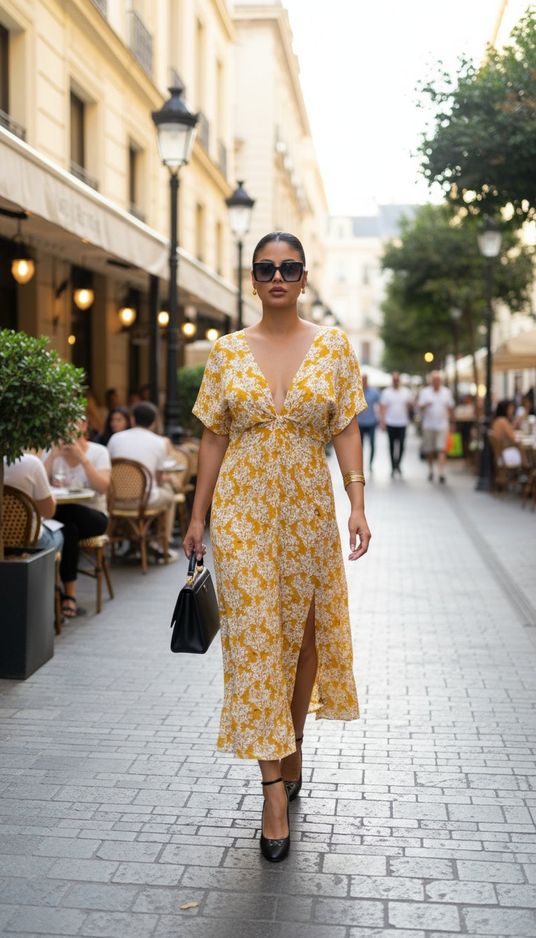 Vestido largo marrón con estampado floral beige, escote en V y cintura ajustada. 100% ALGODÓN