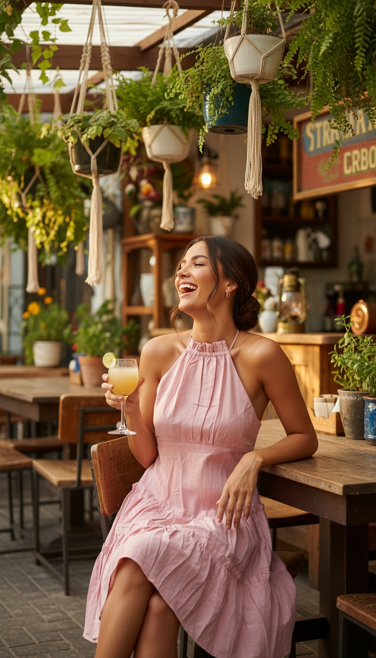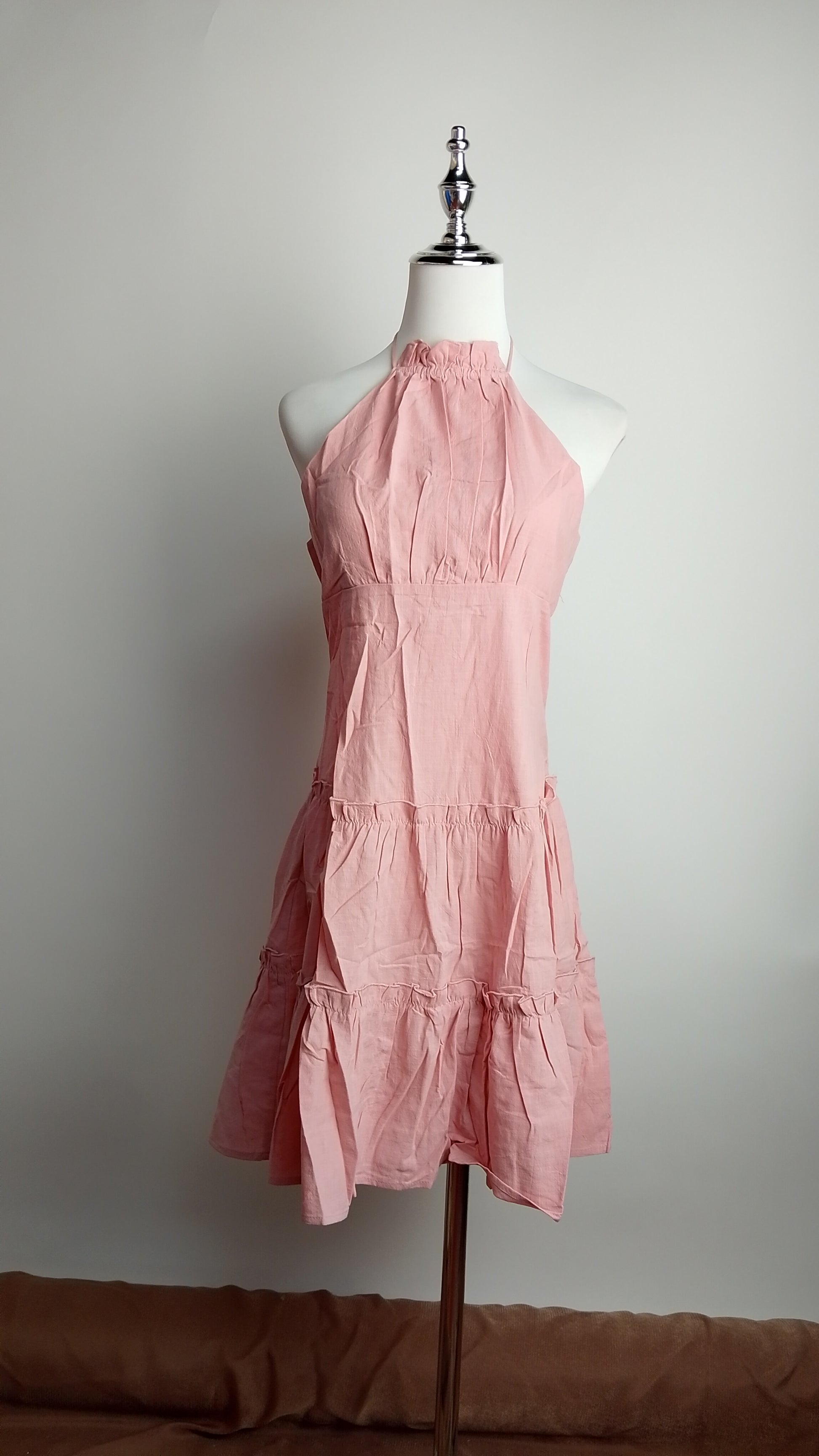 Vestido corto color rosa pastel con diseño plisado y corte sin mangas. Ideal para ocasiones casuales o de verano.